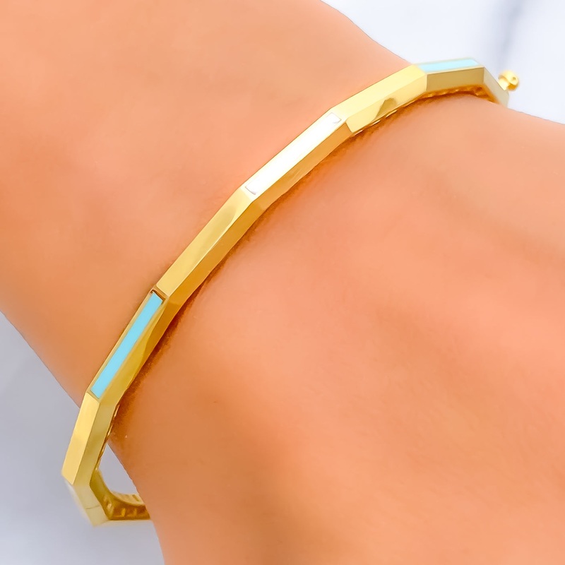 This 21k gold bangle bracelet, weighing 10.0 grams, stands out with its charming multi-color accents that add a vibrant and playful touch. The polished yellow gold finish enhances its elegant design, making it suitable for various occasions. With a 2.3-inch oval diameter, it offers a secure and comfortable fit, while the openable spring hinge with push lock ensures easy wear. Perfect for those who love a blend of subtle sophistication and lively details, this single-piece bangle is a versatile accessory.