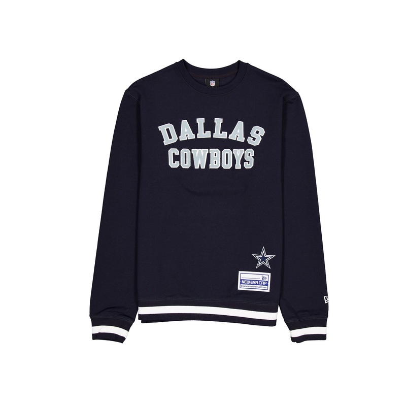 The Dallas Cowboys Team Color Logo Select Crewneck features a zig zag stitched twill applique Cowboys wordmark at the chest with an embroidered team logo above a jock tag at the left hip.