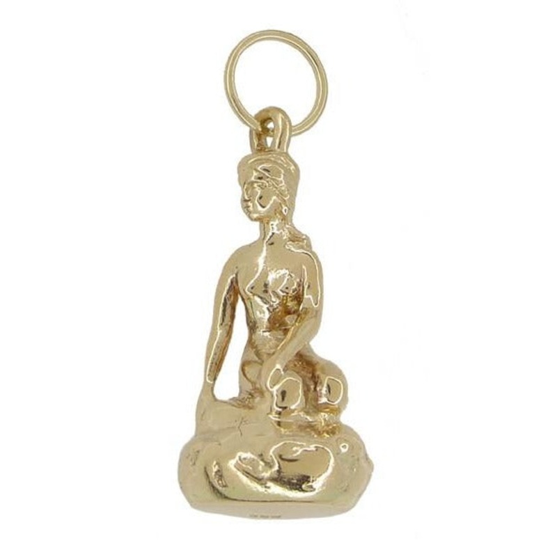One of Denmark's biggest tourist attractions, the world famous Little Mermaid Statue in Copenhagen is faithfully reproduced in this wonderful gold art pendant! A fairy tale dream come true, this lustrous high polish 14K yellow gold charm is solid and three