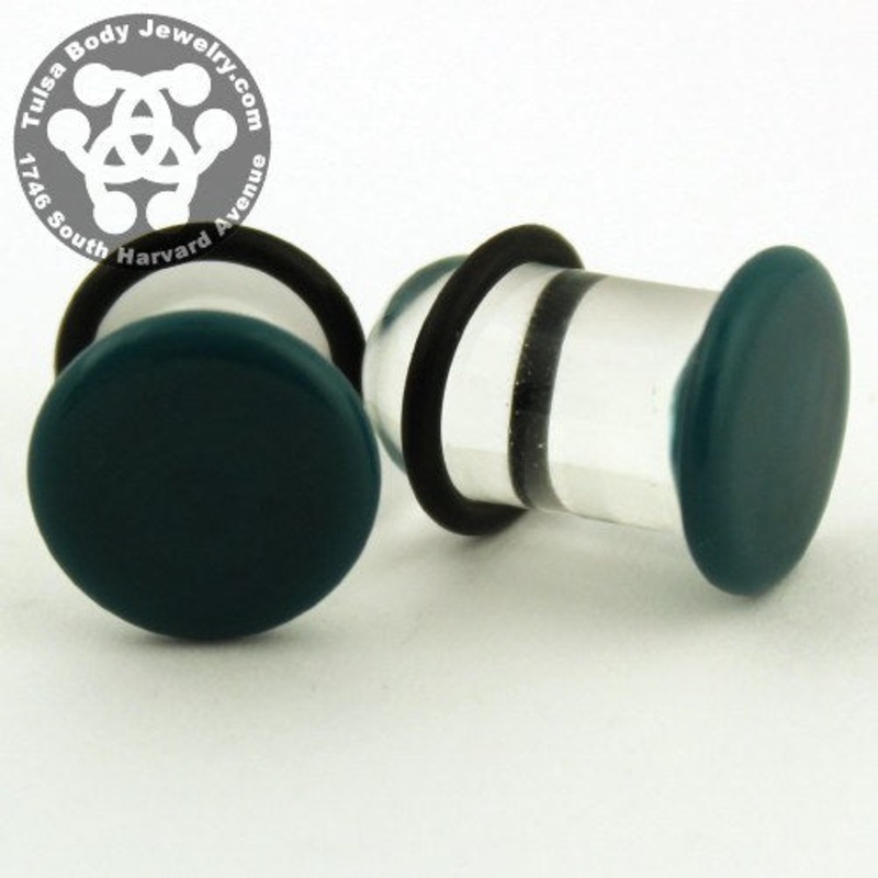 These single flare dark aquacolor front plugs aremade from hand blown borosilicate glass by glasswear studios.They have approximately 3/8" wearable area between the flare and o-ring. Two o-rings are included. Choose your size below.This color has been disc