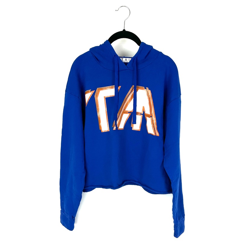 Brand new - donated from the designerTracy Anderson darkblue thin cropped hoodie with a hood, terry cloth interior and "TA" in orange and whiteSize Extra Small (Size 00-0), Small (Size 2-4) , Medium (Size 4-6)100% CottonEstimated Original Retail Price: $65