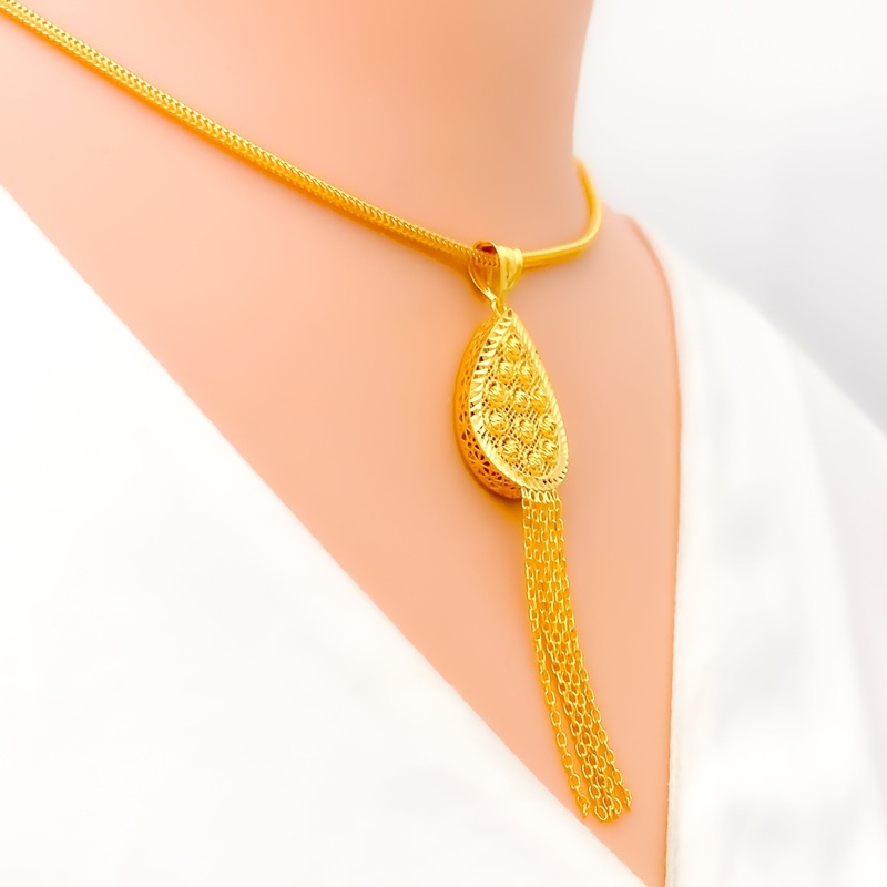 This 22k gold pendant, weighing 4.9 grams, features a dazzling dynamic drop design that exudes elegance and sophistication. The yellow gold finish enhances its luxurious and radiant appearance. Measuring 3 inches in length, this pendant is perfect for addi