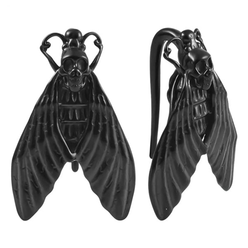 These 6 gauge death’s head moth hangers are cast from black PVD coated 316L stainless steel.