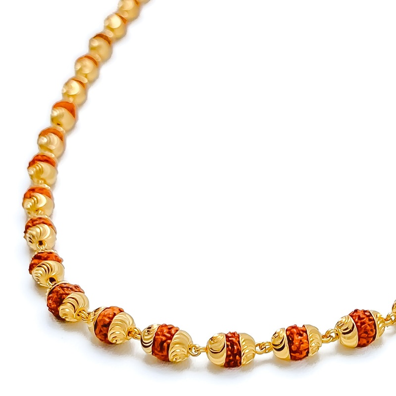 This exquisite necklace features a harmonious blend of 22k gold and Rudraksh beads, totaling 19.9 grams in weight. The gold itself weighs 16.5 grams, while the Rudraksh beads contribute 3.4 grams. It boasts a polished yellow gold finish and measures 28 inc