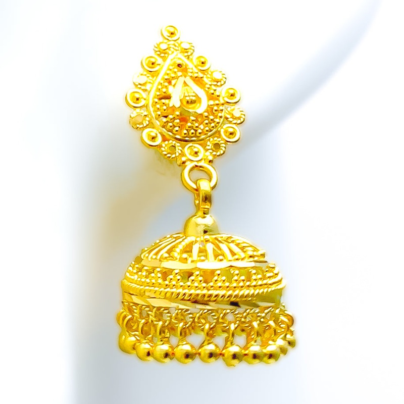 These decorative 22k gold jhumki earrings showcase a beautiful floral striped design, blending elegance with intricate craftsmanship. Weighing 10.3 grams, they offer a lightweight yet luxurious feel. The yellow gold finish enhances their timeless beauty an