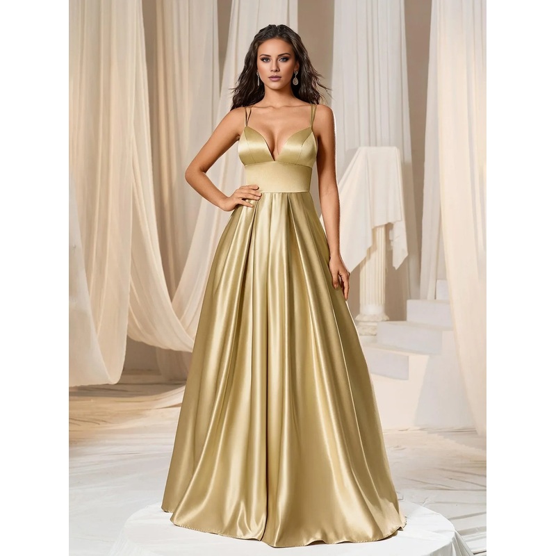 Deep V-neck satin thin shoulder strap and floor length formal dress