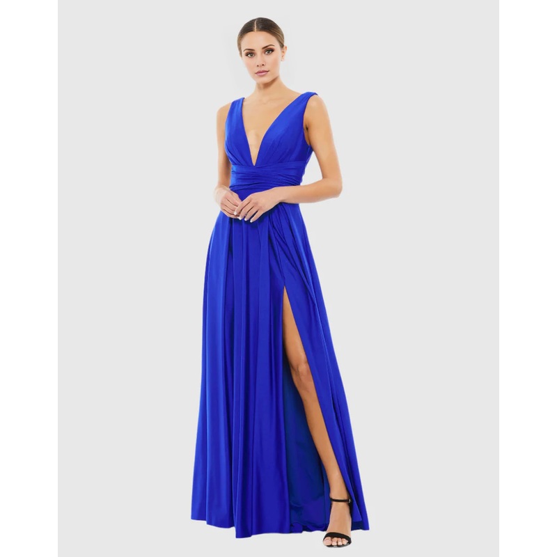 Deep V neckline sleeveless backless side slit floor length evening dress