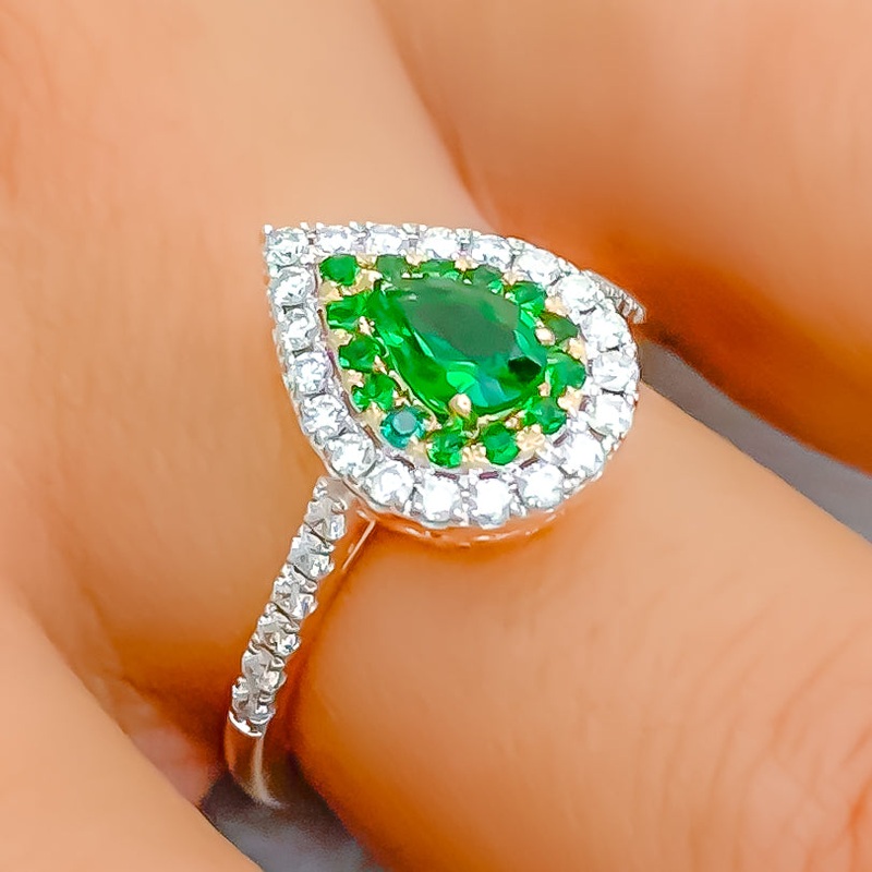 Elevate your style with our Delicate Dapper 18K Gold + Diamond Ring. Crafted with care from exquisite 18k rose gold, weighing 3.5 grams, this stunning piece features a brilliant round-cut diamond weighing 0.35ct. Radiating in F-G color and VS quality, it exudes elegance. Complemented by a beautiful pear drop-shaped cultured emerald, this ring is a true gem. Available in size 6, with ring sizing options for a perfect fit.