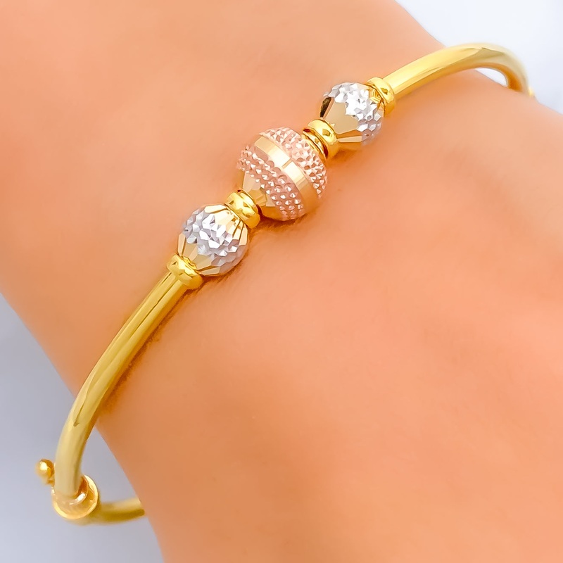 This delicate 22k gold bangle bracelet exudes poised elegance and refined beauty. Weighing 10.7 grams, it offers a perfect balance of luxury and comfort. The bracelet features a harmonious blend of yellow, white, and rose gold finishes, adding a touch of subtle sophistication. With a diameter of 2.25 inches and an oval opening shape, it ensures a graceful and comfortable fit. Designed for convenience, it is openable with a spring hinge and offers the option of no lock or push lock for secure wear. This single-piece bangle is perfect for adding a touch of delicate charm to any outfit, making it a lovely addition to your jewelry collection.