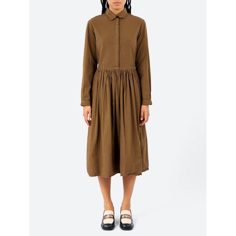This Hannoh Wessel dress is a modern wardrobe staple with subtle, thoughtful details. Crafted from pure cotton, the design features a spread collar and a clean, concealed button placket for a refined, shirt-dress silhouette. A gathered waist adds gentle shape through the front, while an elasticated waistband at the back ensures a comfortable, flattering fit. Side pockets offer everyday functionality, and a softly gathered back yoke detail enhances the relaxed yet tailored feel.