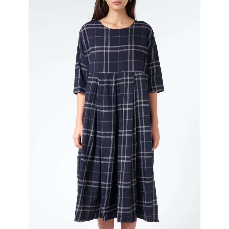 Hannoh Wessel midi dress in a navy tartan pattern. Made from cotton with slight stretch and cut oversized.Round necklineDropped shoulderThree-quarter length sleevesPleated skirtRaw edges at the hemMaterialsFabric Content: 99% cotton, 1% elastaneLining: 100