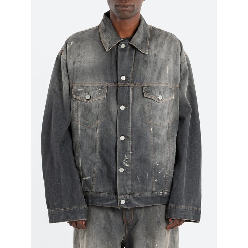 Acne Studios denim jacket is crafted from non stretch denim in a dark wash with tinted and painted mark detailing.Point collarFront button closureDropped shouldersExtra long sleevesChest pocketsSide pocketsOversized unisex fitMaterialsFabric Content: 100%