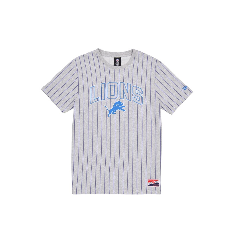 The Detroit Lions Throwback Gray Pinstripe T-Shirt features an embroidered Lions wordmark above an embroidered team logo at the front.