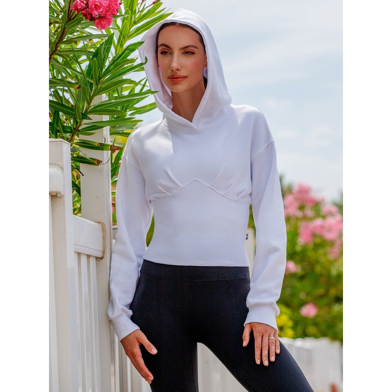 ADD A TOUCH OF FEMININE ELEGANCE TO YOUR COZY LOUNGE STYLE. FEATURING RUCHED BUST AND RIBBED CORSET IN SOFT NATURAL COTTON THATS BOTH FIGURE-FLATTERING AND SUPER COMFY.Long sleeve hoodie with the perfect balance of comfort and styleRibbed cuffs and corsetR