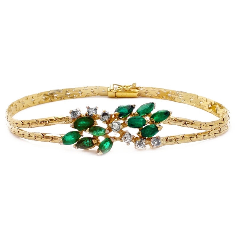 Precious Metal:14 Karat Yellow GoldType of Clasp:Custom BoxLockGemstone:Diamonds: 0.21 Carats (Round)Emerald: 1.0 Carats (Marquise)Floral Height: 10.5 mmLink Width: 4.0 mm*Length:8Inches*Weight:8.7grams**All weights and measurements are approximate.Please