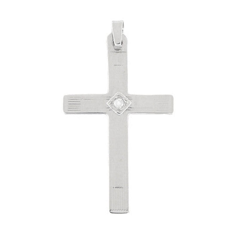 Lovingly fashioned in solid 14K white gold, this vintage pendant, circa 1950’s, is engraved on the front with a geometric pattern and set at its center with a diamond of 0.01 carat. Measures 1 1/8 inch high by 11/16 inch wide. The perfect gift for a loved one, this vintage diamond cross is sure to be cherished.