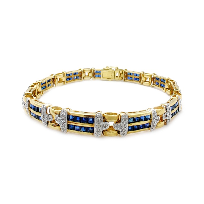 Precious Metal:14 KaratTwo-Tone GoldType of Clasp:Custom BoxLockGemstone:Diamonds (Round)Blue Sapphire (Princess-Cut)Width:7.0 mm*Length:7.5 Inches*Weight:16.2grams**All weights and measurements are approximate.Please contact us if you have further questio