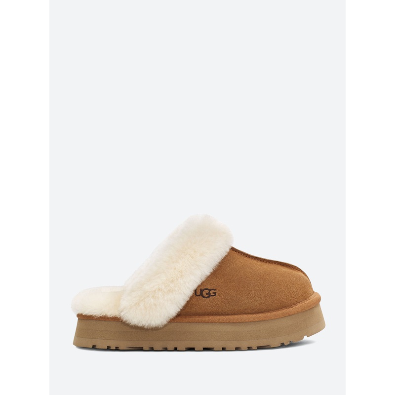 The UGG Disquette adds a 1" retro-style platform sole to a familiar slip-on silhouette for outdoor wear, all-day cushion, and a maximalist look.Slip-on styleSheepskin collarTextile bindingWoven label with logo on insoleHeat-embossed logoRound toeMaterialsU