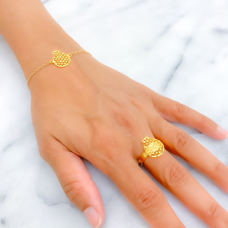 This 21k gold bracelet and ring set, weighing 3.8 grams, features a distinct and impeccable curvature design that exudes elegance and sophistication. The yellow gold finish enhances its luxurious and radiant appearance. The bracelet measures 7.25 inches in length and is secured with a lobster ring lock for added safety and convenience. The matching ring is sized at 7, with resizing available to ensure a perfect fit. Perfect for those who appreciate refined beauty and exquisite craftsmanship, this stunning bracelet and ring set is a standout addition to any jewelry collection.
