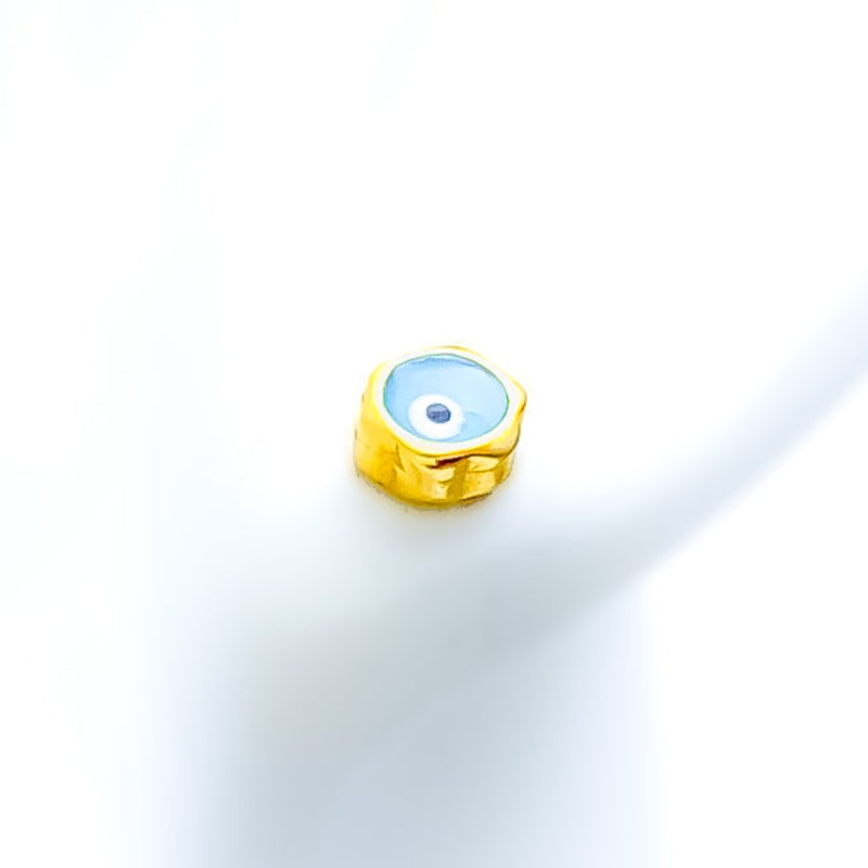 Modern and meaningful, these 21k gold evil eye earrings blend style with symbolism, offering a unique and fashionable charm. Weighing 1.5 grams, their radiant yellow gold finish highlights the intricate evil eye design, creating a refined yet protective accessory. With a compact 0.25-inch diameter, these trendy tops provide a subtle yet striking presence, perfect for everyday wear. Secured with a convenient push-back post, they ensure a comfortable and secure fit. Designed for those who appreciate distinctive jewelry with a contemporary touch, these earrings are a chic and timeless addition to any collection.