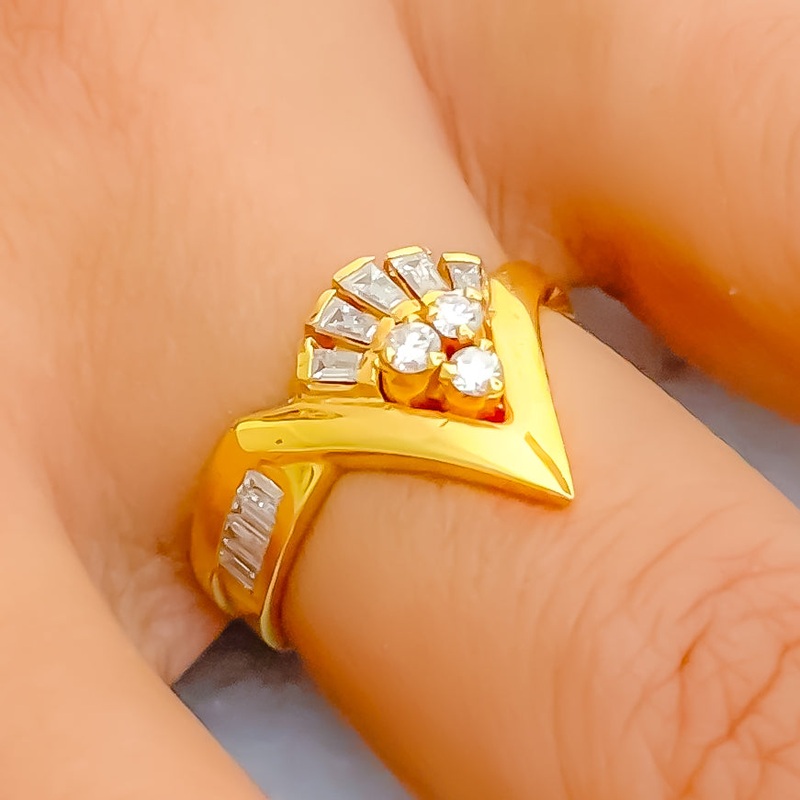 Distinct Vanki Diamond Ring, a true embodiment of individuality and style. Crafted with 18k yellow gold, this ring features a sleek weight of 3.2g, enhancing its modern appeal. Adorned with a captivating combination of 0.36ct round and baguette-cut diamond