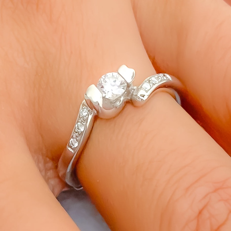 This elegant 18k white gold ring, weighing 3.8 grams, is adorned with 0.25 carats of round brilliant diamonds in F-G color and VS quality, exuding a refined sparkle. With its distinct design and timeless appeal, this piece is ideal for those who appreciate