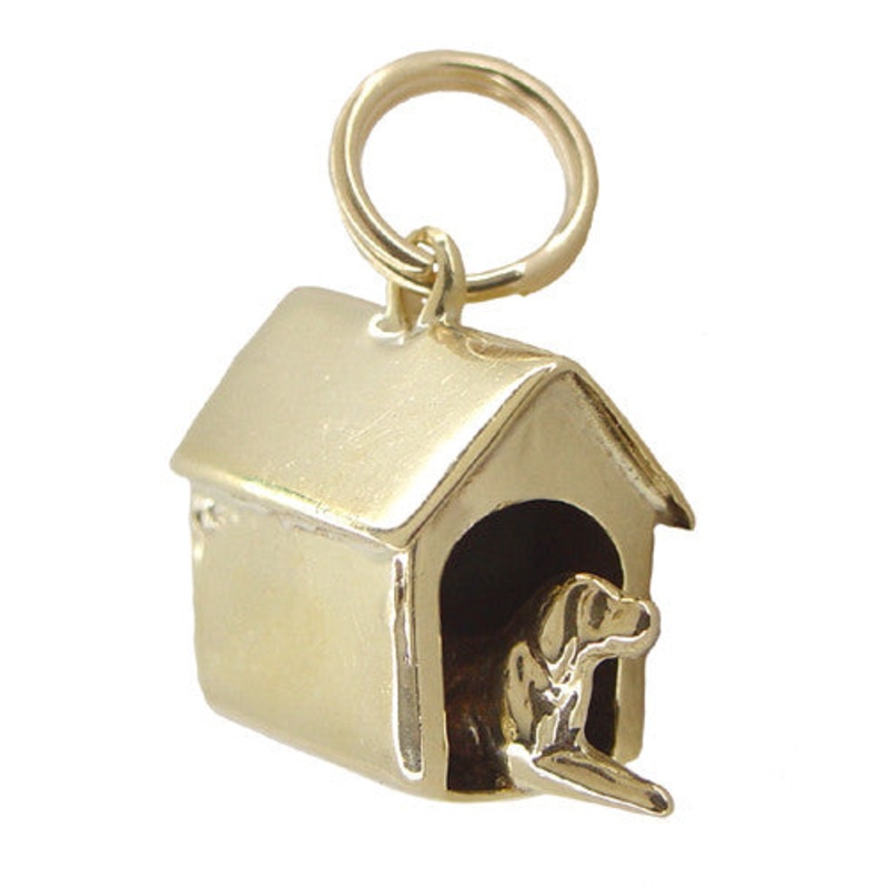 Woof! This vintage charm, circa 1950’s, is a wonderful way to celebrate your love for your favorite canine companion! This unusual three-dimensional charm in 10K gold measures 3/8 inch high by 7/16 inch wide by 5/16 inch deep and features a 14K yellow gold split ring bail that makes this dog in a dog house charm perfect to wear on a favorite neckchain or easily and securely attaches this charm to a charm bracelet.
