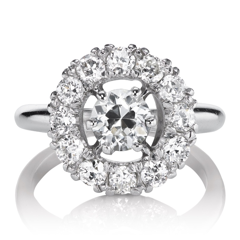 The Dolores ring is an authentic vintage J.E. Caldwell diamond cluster ring circa 1961. The ring centers a GIA-certified 0.69 carat Transitional Cut diamond of J color, SI1 clarity. Surrounding the center stone is a halo of 12 Old European Cut and Transitional Cut diamonds combining for approximately 0.85 carats of I-J color, VS-SI clarity. The stones are set in a Platinum prong setting. The ring is currently size 5.25 and can be resized!