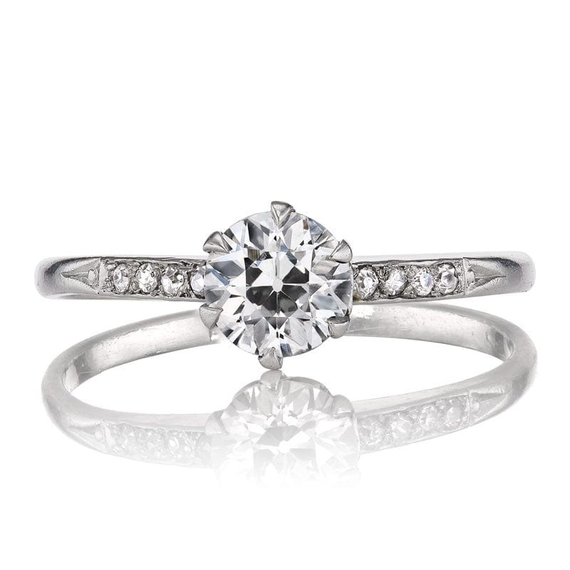The Dorothy ring is an authentic vintage diamond ring from the Art Deco Era circa 1920. The ring centers a GIA-certified 0.62-carat old European cut diamond of H color, SI1 clarity. The stone is set in a 6-prong platinum setting with 4 diamonds on each shoulder. The ring is currently size6 and can be resized!
