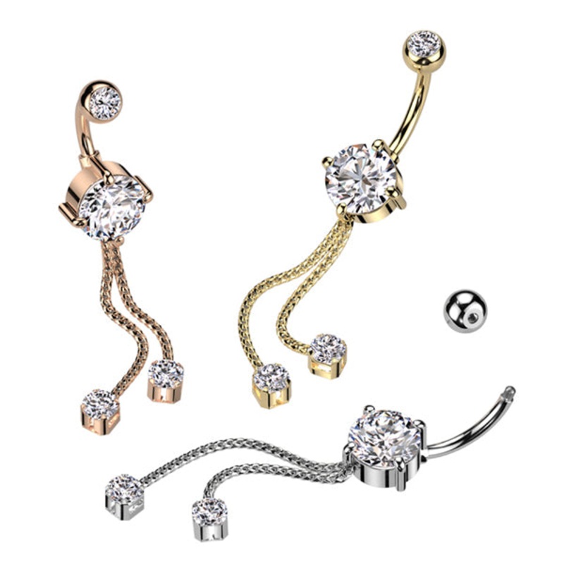 The 14 gauge double czbelly dangle is made from 316L stainless steel with external threading. Only the 5mm top ball is removable. Choose your finishbelow.