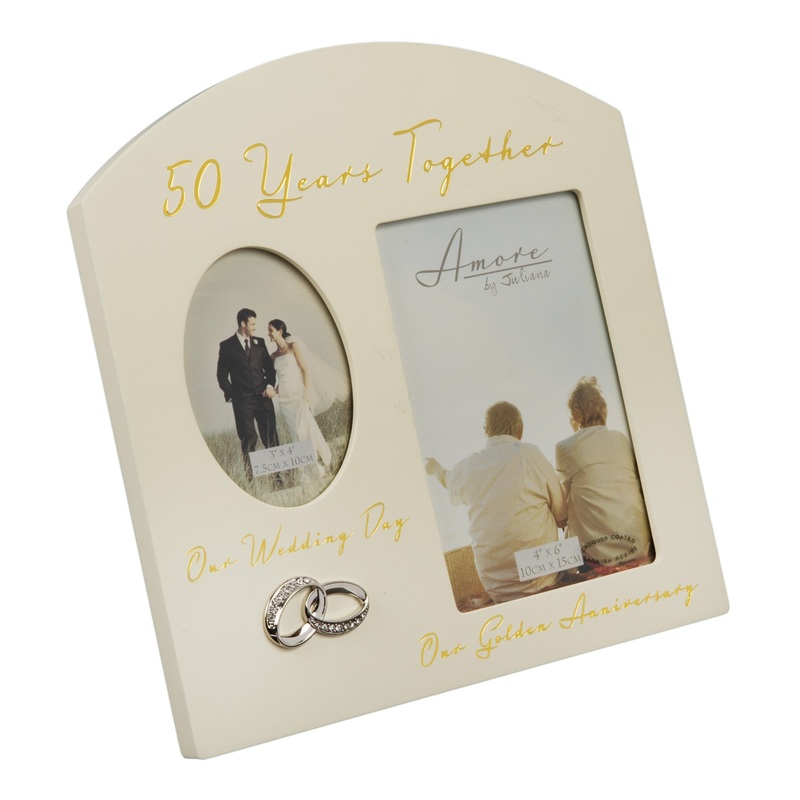 This 50 Year Anniversary Double Photo Frame is a perfect way to celebrate 50 years together.Decorated with Beautiful Wedding Rings with Crystals.A Beautiful Frame. Ideal Anniversary Gift.