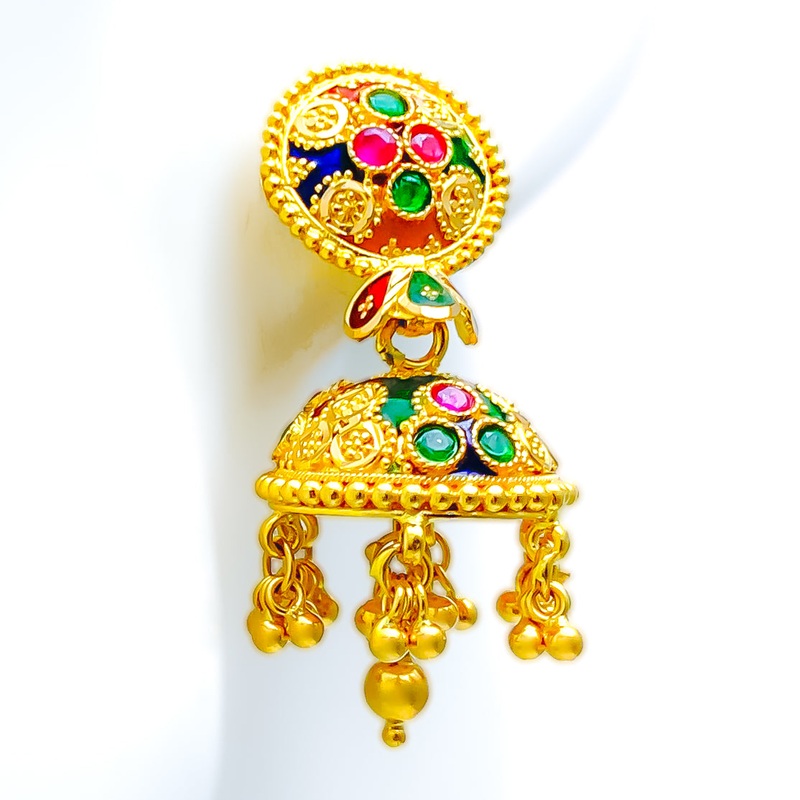 These 22k gold Jhumki earrings weigh 19.5 grams and feature a dressy majestic tasseled design, complemented by a luminous yellow gold finish. Each earring is 1.5 inches long and secures with a screw back post. Perfect for those who seek a blend of classic