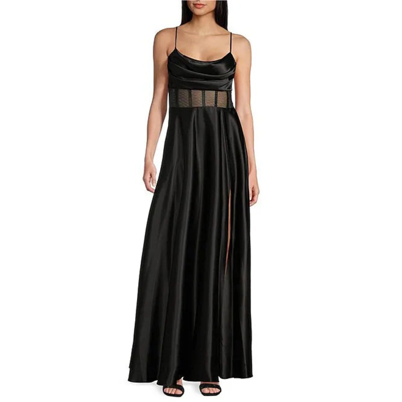 Dropped collar illusion tight fitting corset satin prom dress