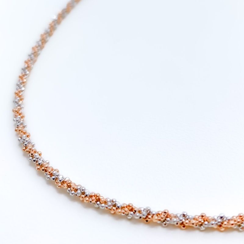 Indulge in elegance with this exquisite Dual Tone Popcorn 22K Gold Chain. Crafted with 22K gold purity, it features a captivating combination of white and rose gold. Weighing 10.7 grams and measuring 18 inches in length with a width of 2.5 millimeters, thi