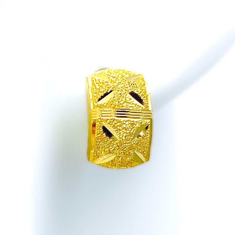 These 22k gold earrings, weighing 2.7 grams, feature an edgy and lustrous design that exudes modern elegance and sophistication. The yellow gold finish enhances their luxurious and radiant appearance. Measuring 0.5 inches in length, these tops-style earrin