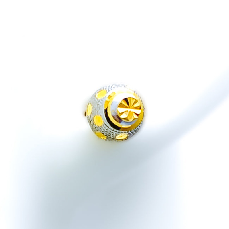 These effortless 22k gold top earrings feature a charming dotted design, perfect for everyday wear. Weighing 2.1 grams, they offer a lightweight yet luxurious feel. The yellow gold finish enhances their classic appeal. With a diameter of 0.25 inches, these earrings are designed in a versatile tops style, making them suitable for any occasion. The push-back posts ensure secure and comfortable wear. Add a touch of understated elegance to your jewelry collection with these beautifully crafted dotted top earrings, ideal for enhancing your everyday look with ease and sophistication.