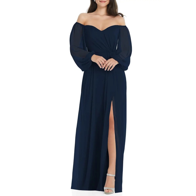 Elegant and minimalist long sleeved strapless off shoulder chiffon and floor length off back evening dress