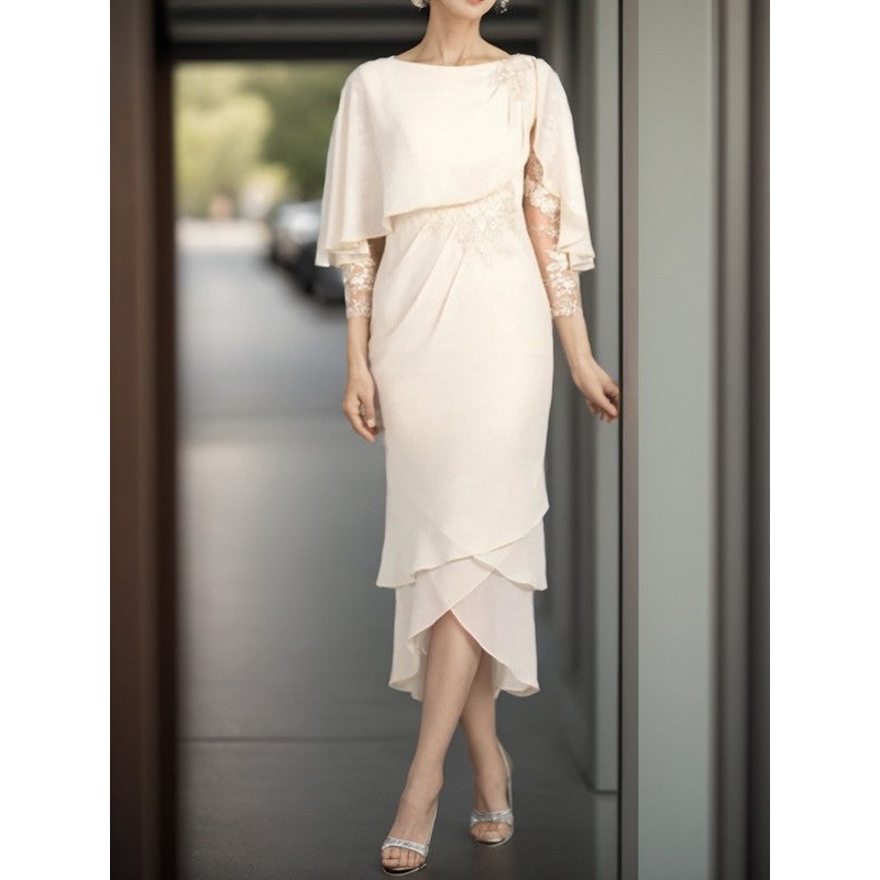 Elegant Lace Applique 3/4 Sleeve Chiffon Tea Long Style Mother of the Bride Dresses
