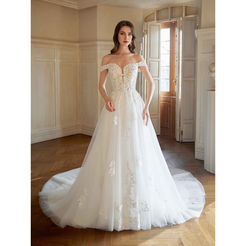 Elegant off shoulder A-line ultra long lace wedding dress