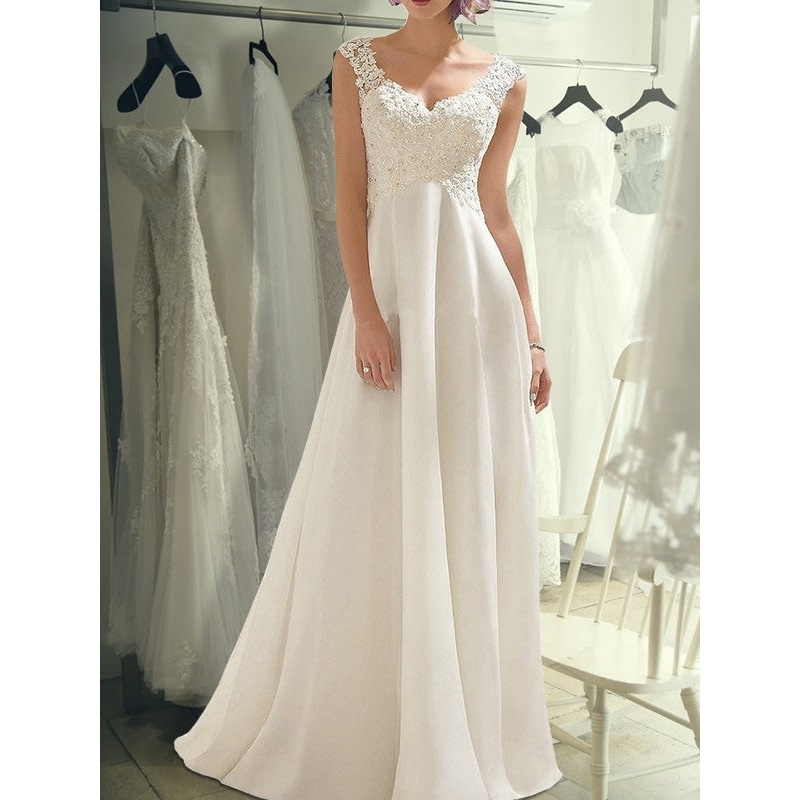 Elegant sleeveless V-neck lace chiffon and floor length wedding dress
