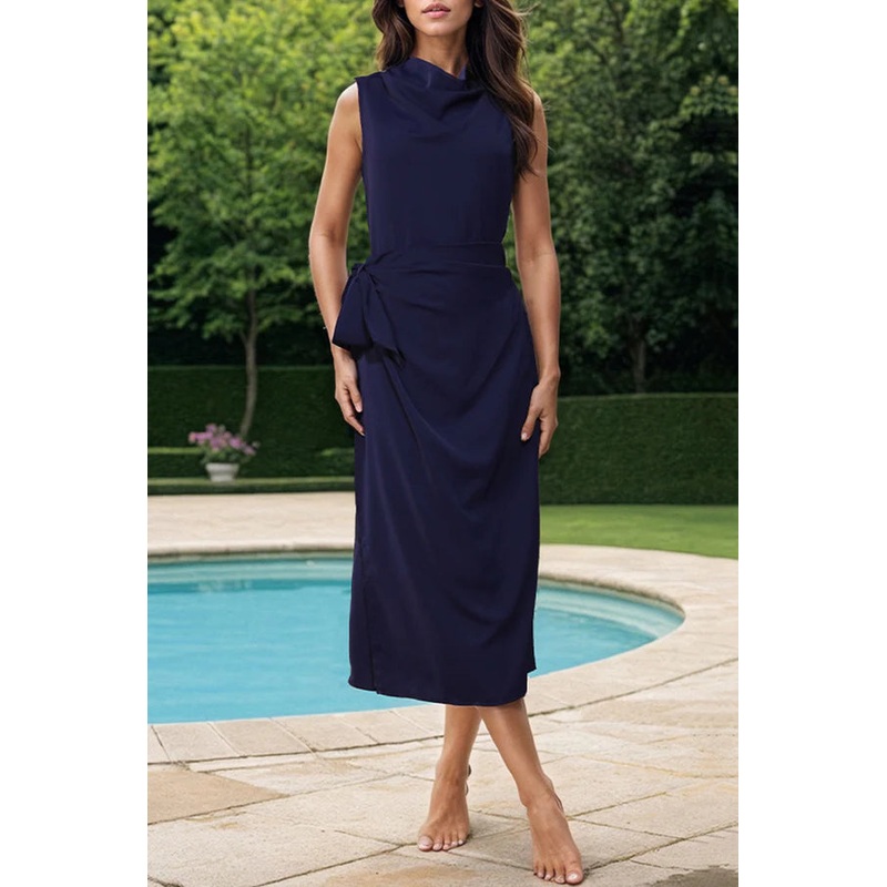 Elegant solid color bandage slit scarf collar sleeveless evening dress