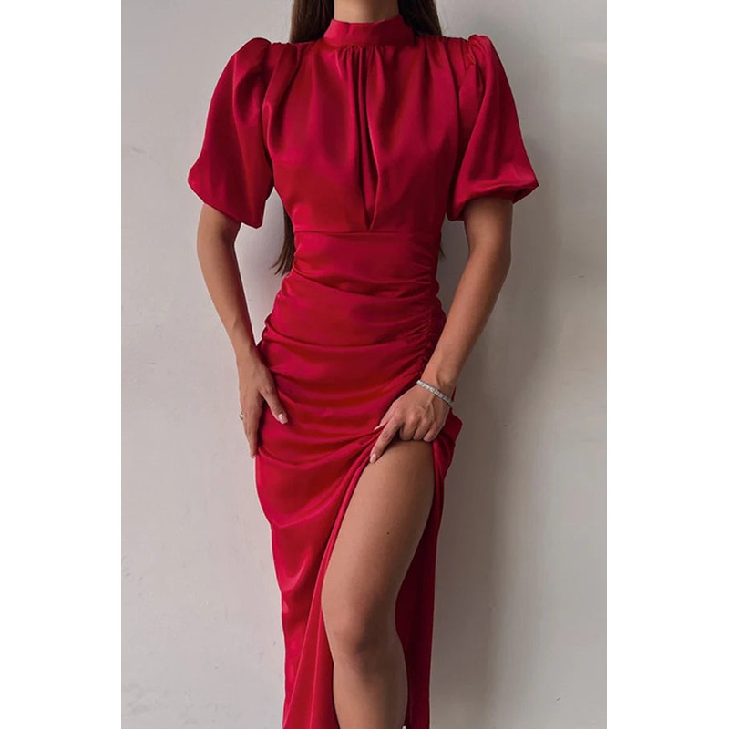 Elegant solid color pleated half high collar one step skirt for evening dress