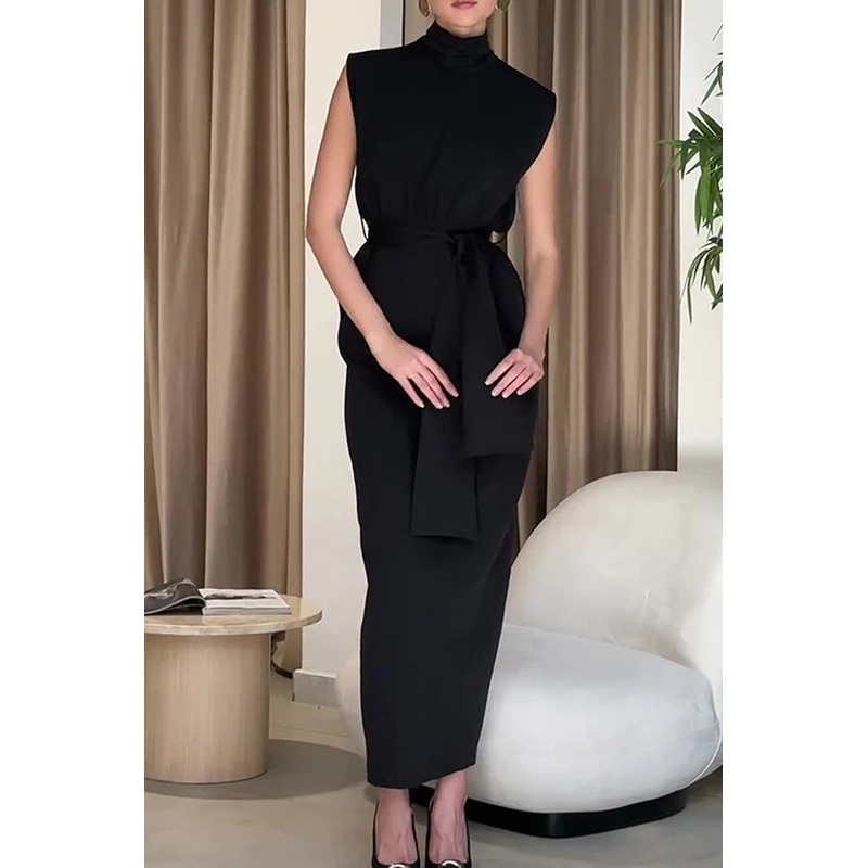 Elegant solid color slit with waistband half high neckline skirt evening dress