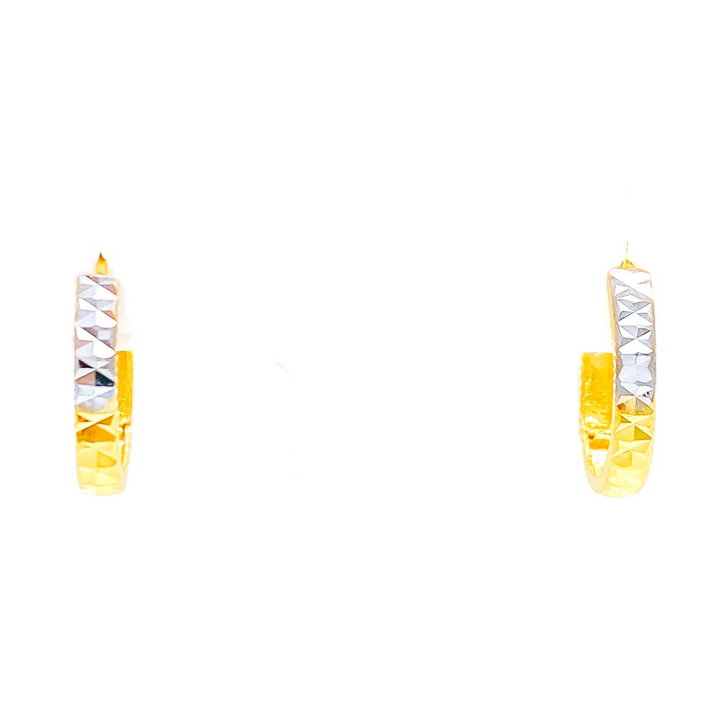 These 22k gold Bali earrings, weighing 3.2 grams, feature an elegant and twinkling design with a combination of yellow and white gold finishes. The dual-tone enhances their luxurious and sophisticated appearance. With an earring diameter of 0.6 inches, these Bali/hoop earrings are perfect for adding a touch of sparkle to any outfit. Ideal for those who appreciate refined beauty and contemporary style, these stunning earrings are a standout addition to any jewelry collection.