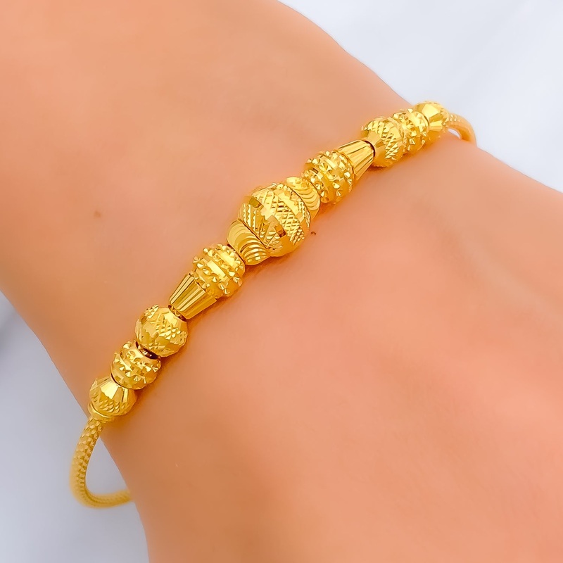 This striking 22k gold bangle, weighing 8.7 grams, showcases a refined checkered design that exudes sophistication. The luminous yellow gold finish highlights its timeless round shape. With a 2.3-inch diameter and 0.5-inch adjustable links, it ensures a secure yet comfortable fit. Featuring a reliable lobster lock, this bracelet merges contemporary elegance with classic charm. A versatile and polished addition to any collection, perfect for those who appreciate intricate craftsmanship in fine jewelry.