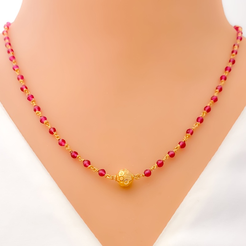 This 22k gold necklace, weighing 9.1 grams, features a stunning design adorned with intricately arranged colored beads. The polished yellow gold finish highlights its refined craftsmanship, while the 18-inch length and 0.75-inch adjustable links ensure a c