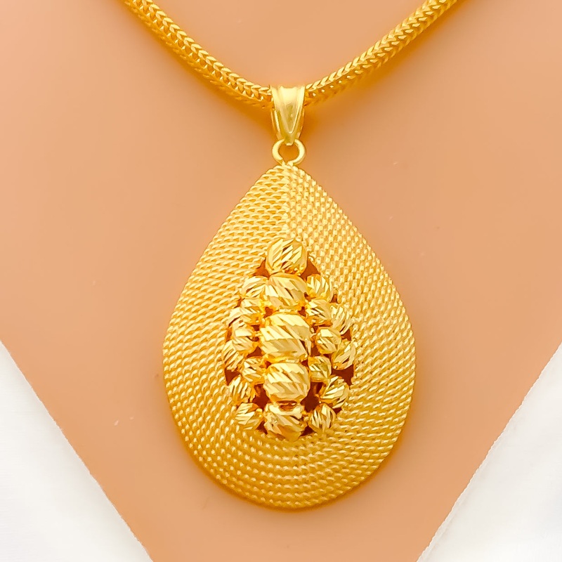 This 22k gold pendant, weighing 5.0 grams, features an elevated unique design that exudes sophistication and style. The yellow gold finish enhances its distinctive appearance, making it a standout piece for any jewelry lover. With a length of 1.5 inches, t