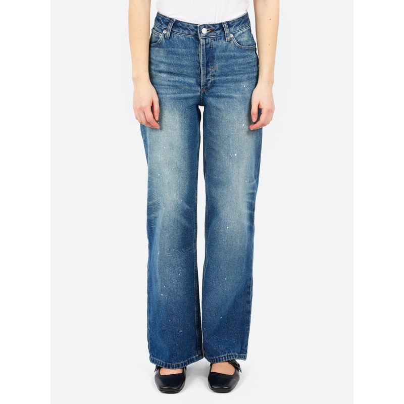 A.P.C. Elisabeth Jeans are a pair of 70s-inspired jeans crafted from “Butler”-effect paint-splattered stonewashed denim, with each pair uniquely hand-painted for a one-of-a-kind look. Featuring a high-rise fit that gently envelops the hips, these jeans offer a flattering, vintage-inspired silhouette. Finished with caramel-colored topstitching, these jeans offer a stylish and distinctive addition to any wardrobe.