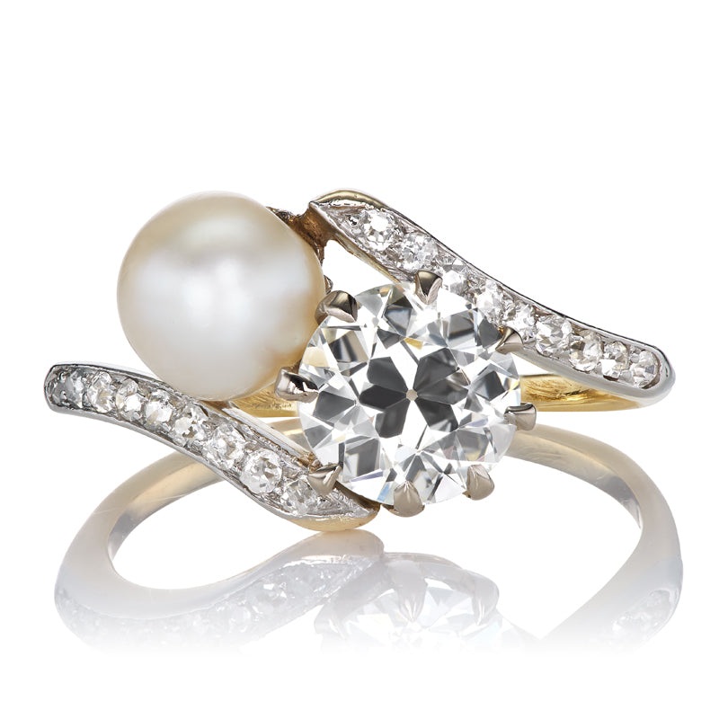Toi et moi, meaning “you and me” in French, is the dreamy name given to rings featuring two stones, and it doesn’t get much more romantic than a diamond and pearl set amongst swooping shoulders of old cut stones. Let these beautiful, natural stones represent you and your beloved, and make a gorgeous statement on the finger while you’re at it.