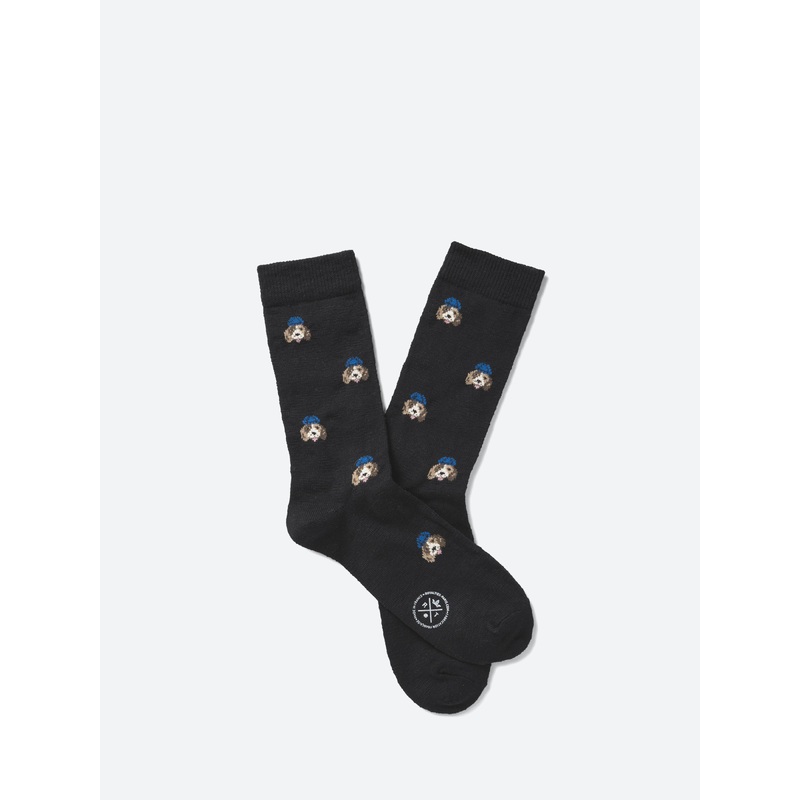 These socks are knitted with slub yarns, which gives them a workwear look. The all-over beagle jacquard pattern adds a playful touch.